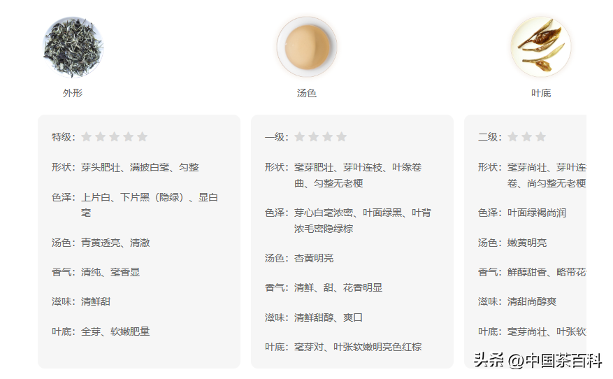 茶面呈黑色,叶背黑白相间,芽头皎洁洁白,似一弯月牙,故名"月光白“”