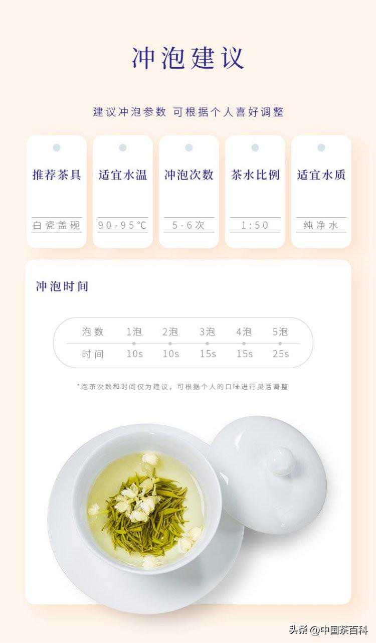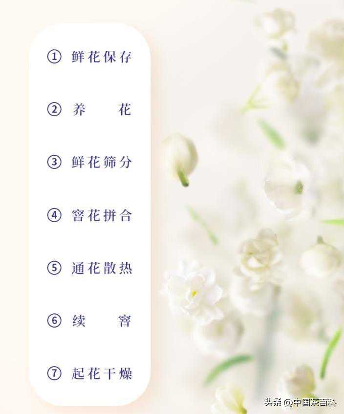 采摘:采花时间在晴日午后,挑雪白晶莹、含苞待放的花蕾,赶在开放前择花,使茶叶趁鲜抢香,再以手工精心窨制