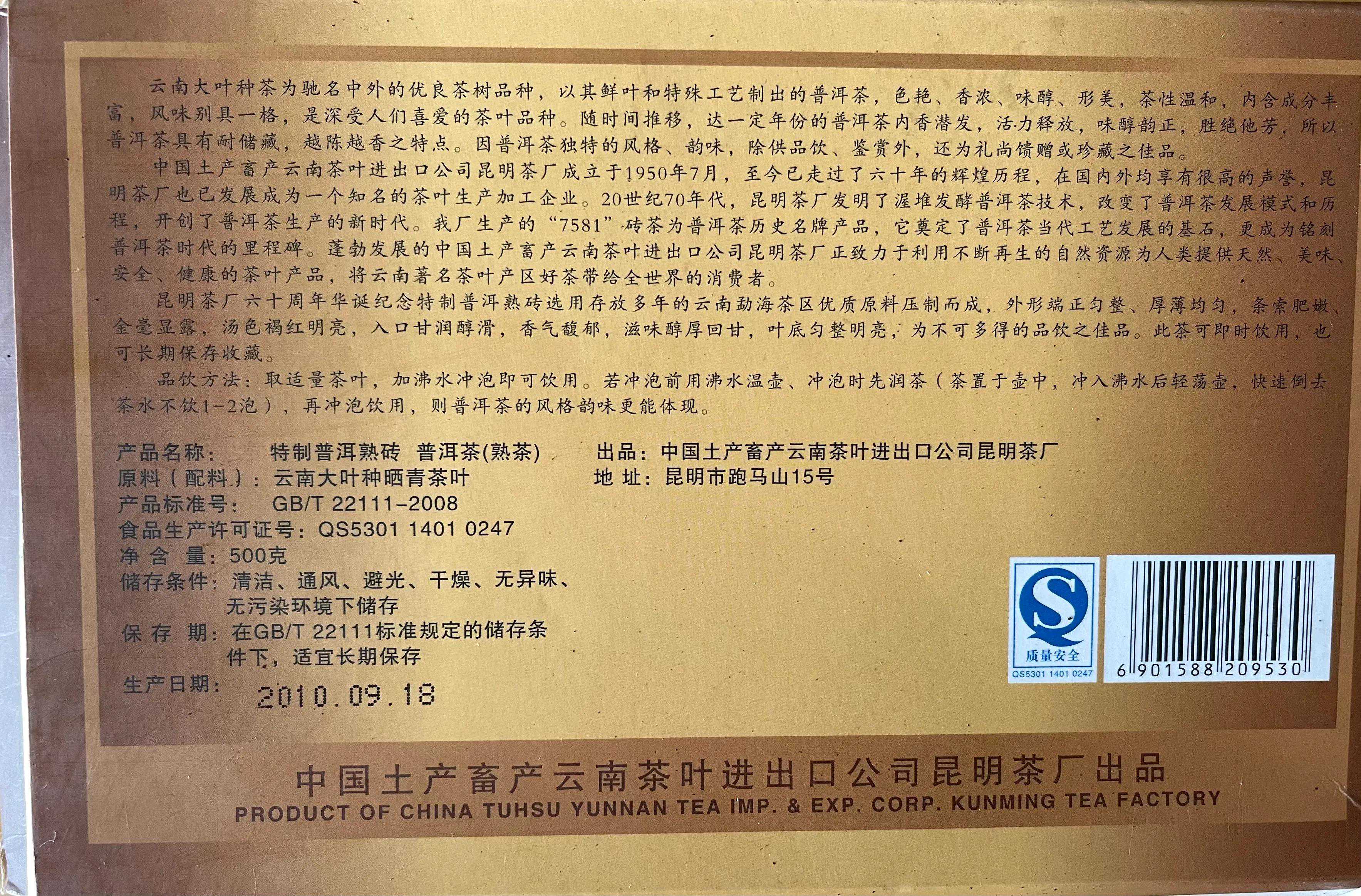 今日分享(2012年入手熟砖):中国土产畜产云南茶叶进出口公司昆明茶厂成立于1950年7月,至今已走过了六十年辉煌历程。「昆明茶厂六十周年华诞纪念(1950-2010)」名称:特制普洱熟砖(中茶牌)产......