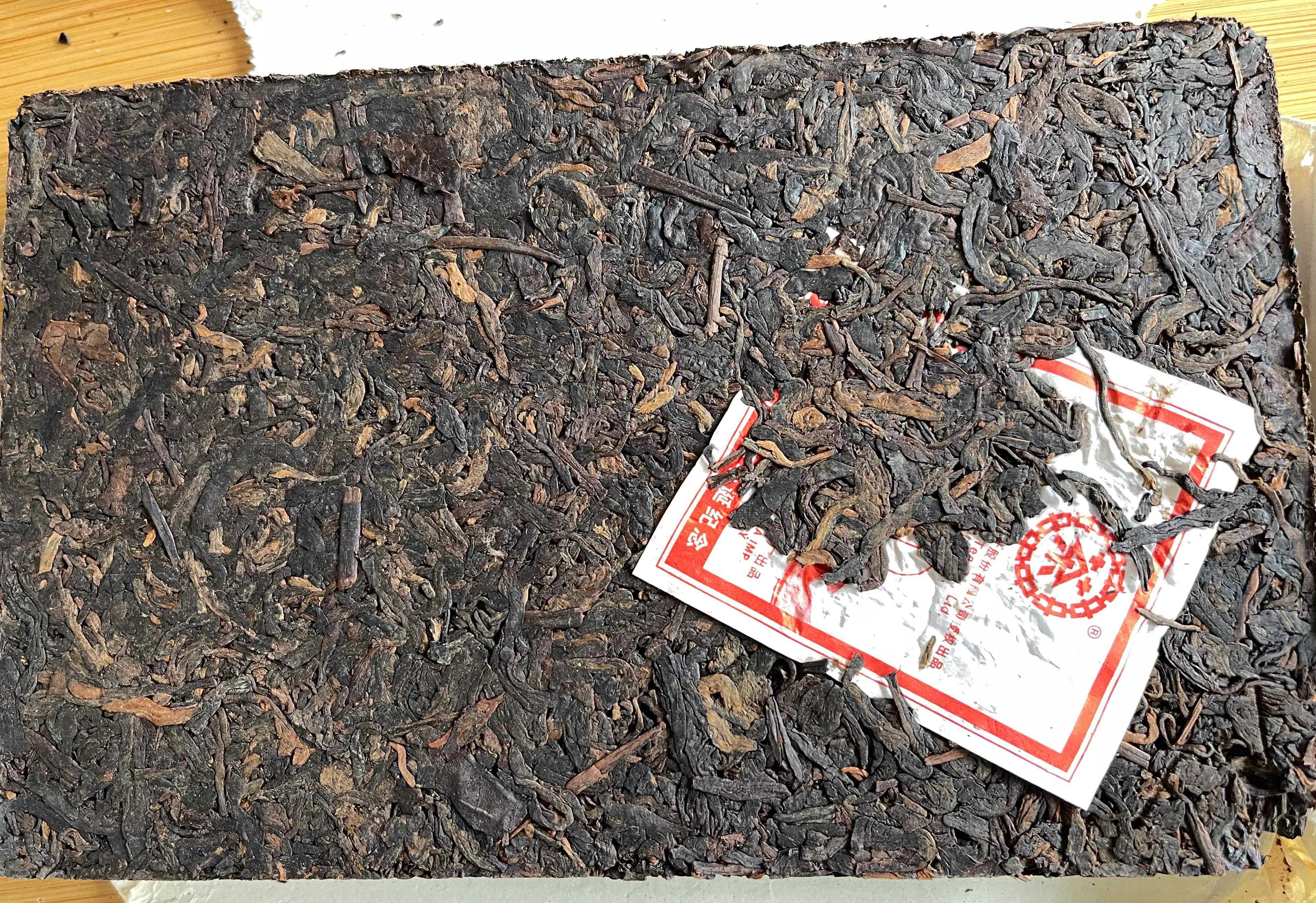 干茶:砖面平整,棱角分明,色泽略黑褐且尚显金毫。干嗅渥堆味略显。