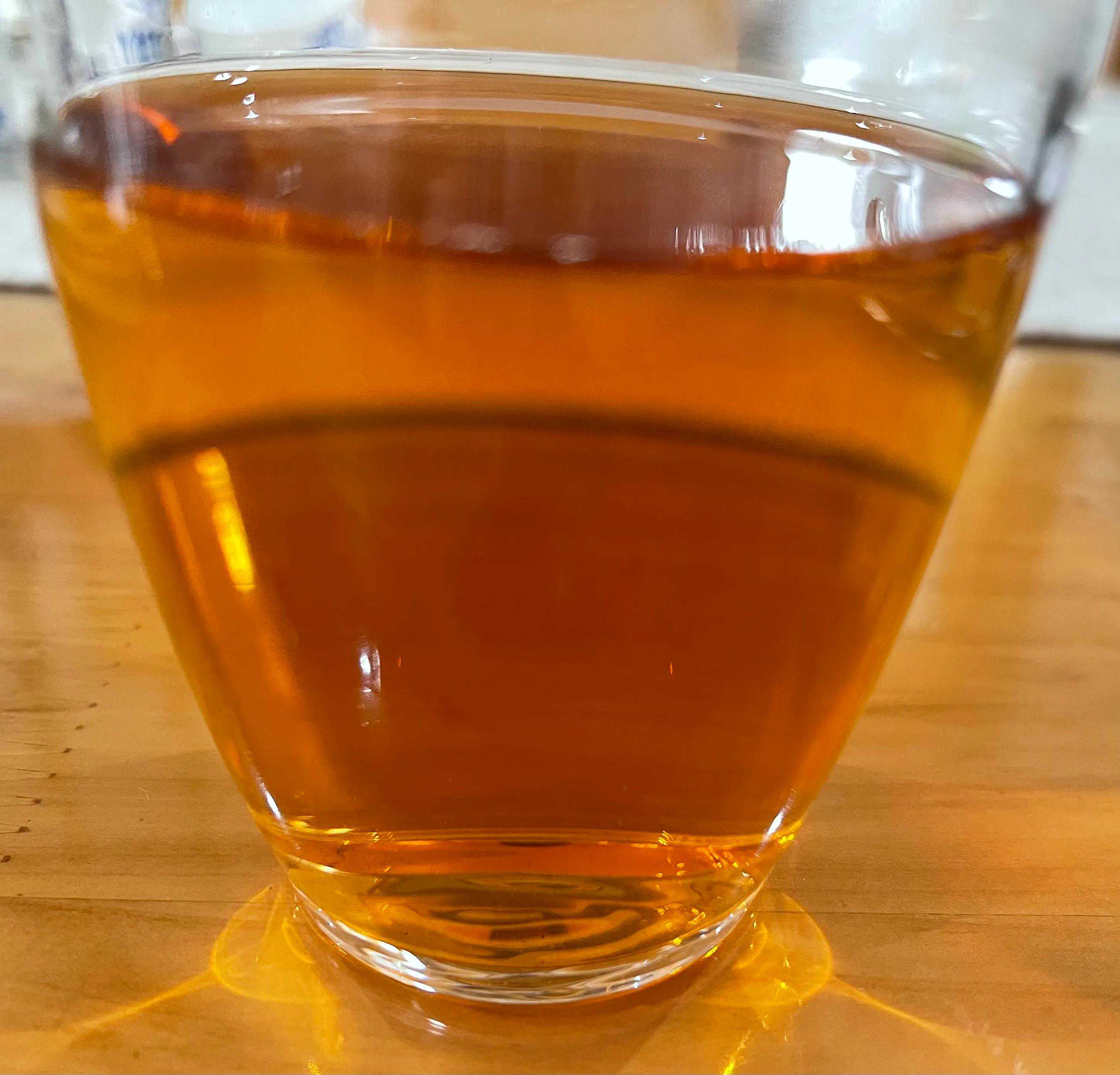 第一泡10″出汤。汤色红中略泛黄且较清亮,汤感略偏薄,渥堆味较轻且又混合淡淡的陈香,挂杯香较一般。