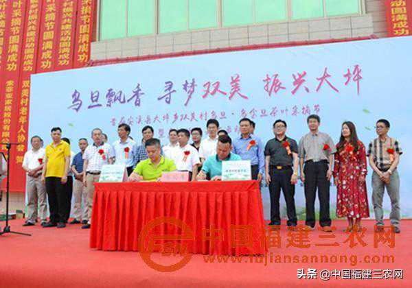 当日,双美村主任高炳锋与汕头响天下茶业公司董事长王连雄、厦门恒利集团公司董事长高树足签订了双美村茶叶产销框架协议,双美村建档立卡贫困户代表高千万与安溪制茶名匠、福建双美大自然茶业有限公司总经理高童谦签定了茶叶包销协议,安溪民生村镇银行支持双美茶产业发展,给予金融授信5000万元等。