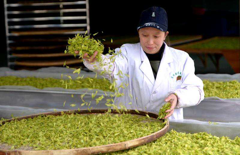 加工厂车间内,制茶工人正在对采收回来的茶叶进行摊凉。