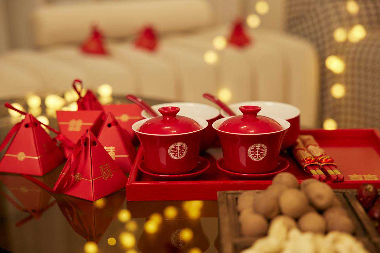 合茶:洞房后夫妻同饮一杯茶,意喻以后要同甘共苦。