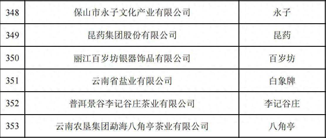 为推动老字号守正创新发展,根据《中华老字号示范创建管理办法》,经企业申报、地方推荐、社会公示,2月1日,商务部、文化和旅游部、市场监管总局、国家知识产权局、国家文物局5部门联合公布第三批中华老字号名单。其中,云南省有6个老字号品牌上榜,入围企业及品牌分别为保山市永子文化产业有限公司(品牌:永子)、昆药集团股份有限公司(品牌:昆药)、丽江百岁坊银器饰品有限公司(品牌:百岁坊)、云南省盐业有限公司(品牌:白象牌)、普洱景谷李记谷庄茶业有限公司(品牌:李记谷庄)、云南农垦集团勐海八角亭茶业有限公司(品牌:八角亭)。
