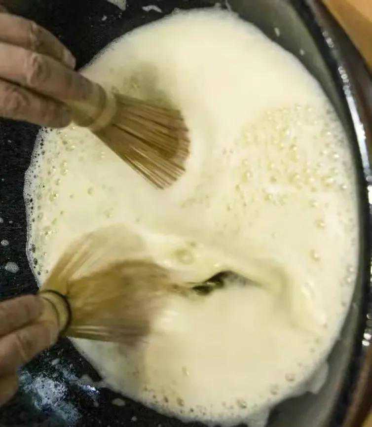 点茶高速击拂会在容器中形成一个电场,产生大量的电荷,物理学上叫“场源电荷”,在这种条件下,茶蛋白分子表面的电子被游离了出来,分子键被打开,形成蛋白分子气团而聚集形成乳花。击拂停止,电荷的场源消失,游离出来的电子重回蛋白质分子表面,分子气团被释放。