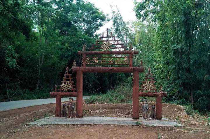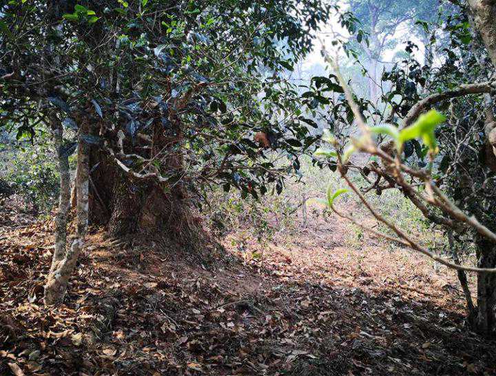 丫口老寨位于南糯山山顶,算是南糯山最偏远的一个茶寨。丫口老寨的古茶树生长于距离寨子很远的原始森林中,从寨子走到茶园,要一个小时,途中走的全是山间林荫崎岖的小路,道路原始,路面只够一人独行。路途中,山道两边古树葱茏,溪水潺潺,清凉无比,丫口老寨的古茶树便隐生在这片葱郁的绿意间。