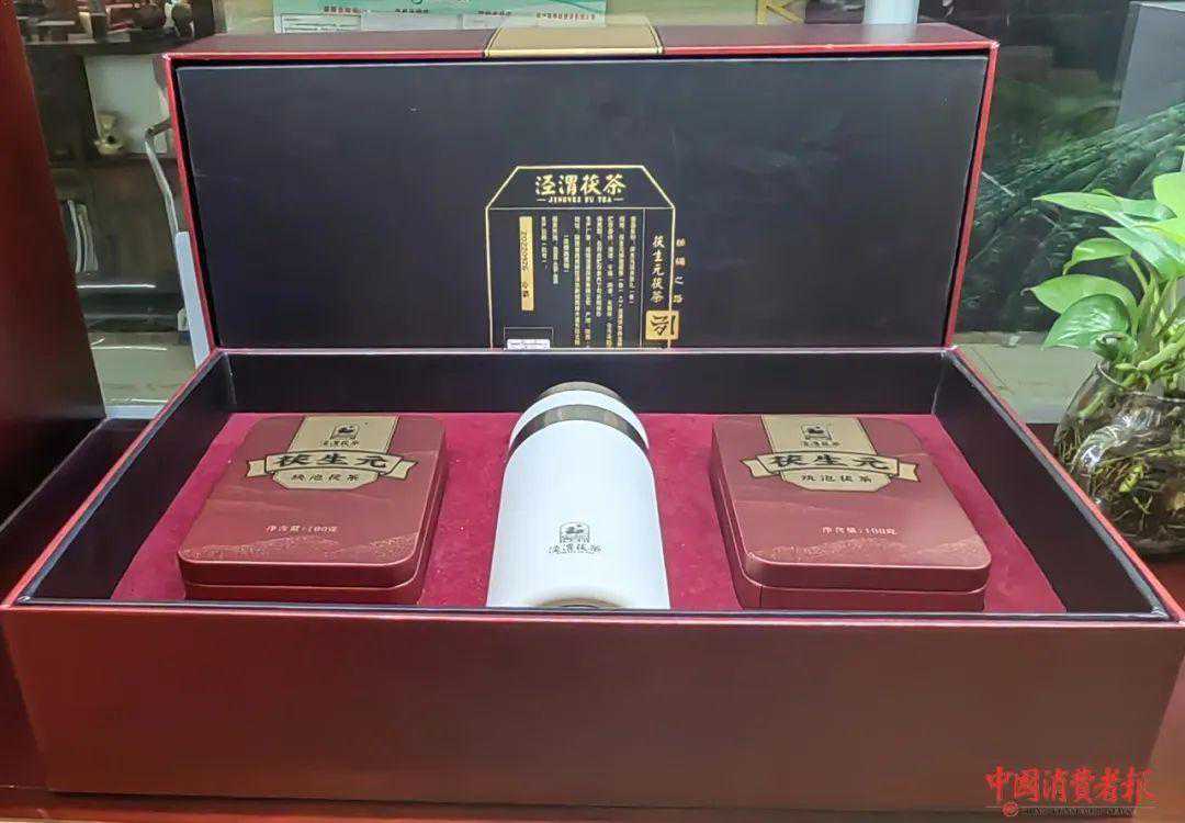 一款名为茯生元的茯茶礼盒内盛装两个铁盒,中间放置一个白色的精致保温茶杯……