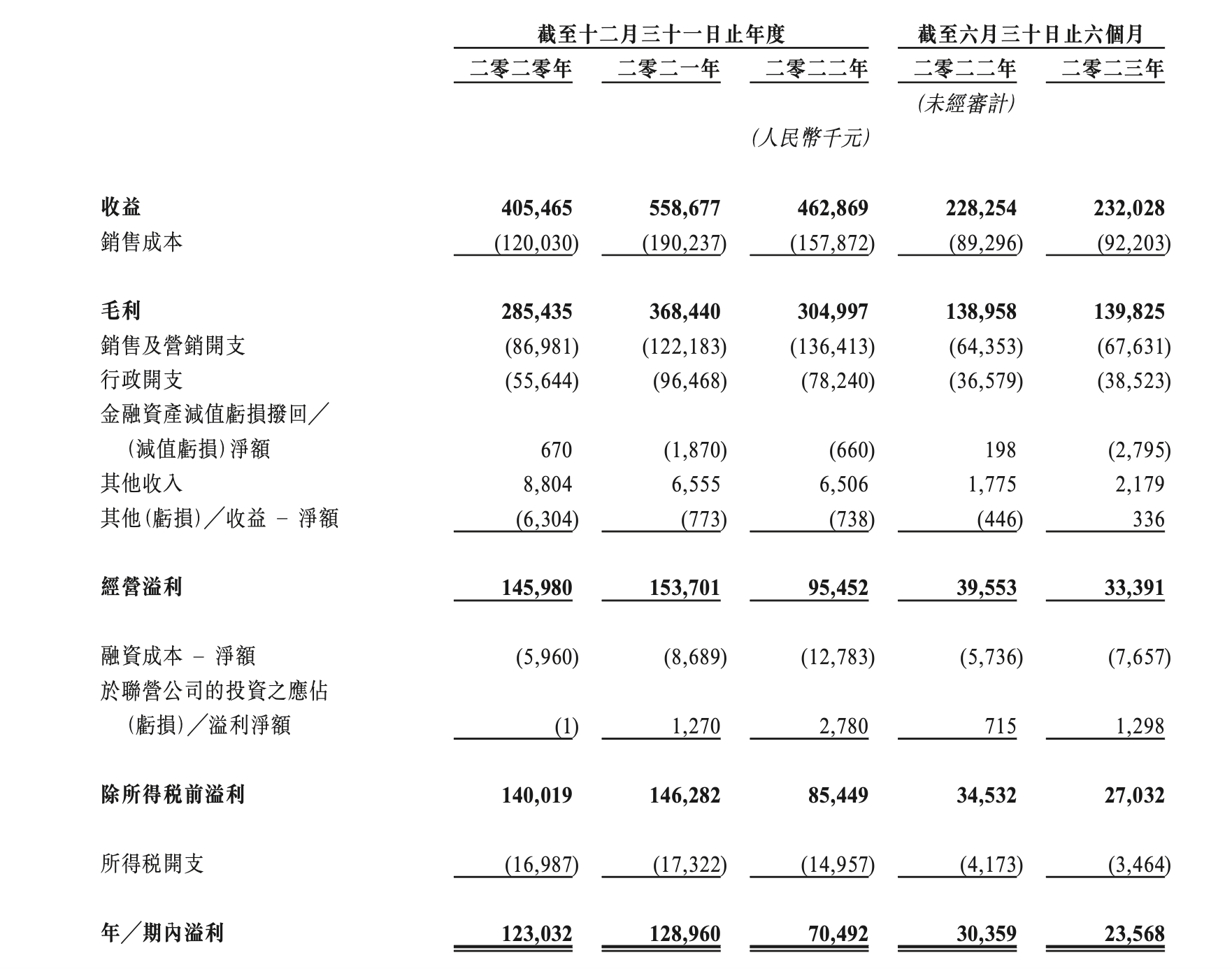 2020年,澜沧古茶曾尝试A股上市,未能成行。从澜沧古茶的营收来看,2020年至2023年上半年整体营收有过增长,但疫情之后,波动较大。招股书显示,2020年至2022年以及2023年上半年,澜沧古茶录得营收分别为4.05亿元、5.59亿元、4.63亿元以及2.32亿元;净利分别为1.23亿元、1.29亿元、0.7亿元以及0.24亿元。