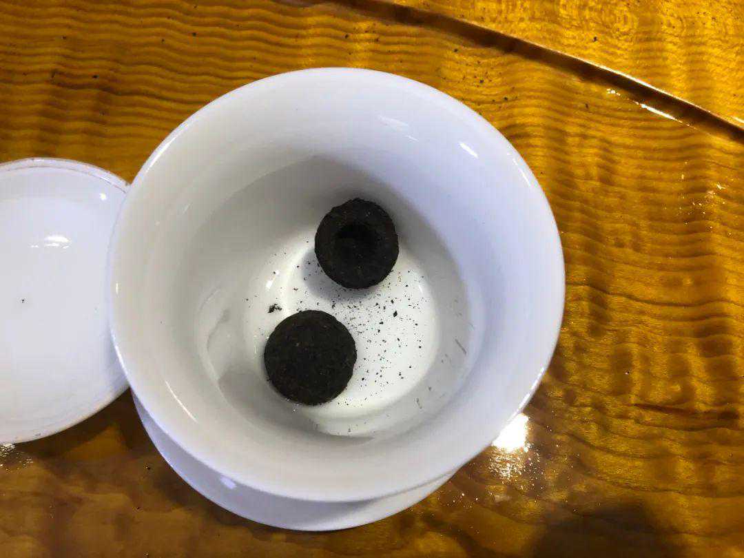 我们挑了两个出来一个4.2克、一个4.9克,总共是9.1克。这茶看起来非常碎,碎茶就闷的时间稍微短一点,因为碎茶断口很多,它的表面面积就比较大,所以茶的水浸出物释放速度会快一些。这茶有一点茶沫的那种感觉了,不是碎茶了。茶香有比较重的仓味,挂杯香仓味倒是不明显,直接闻仓味就比较重。