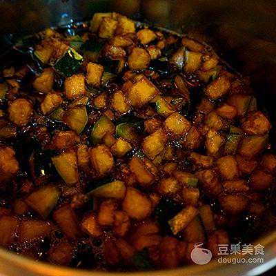 6、连汁带肉儿的一起倒进一个小深锅里,大火烧开之后转小火【中途要不停的搅拌,很容易糊锅底】慢火熬煮一个半小时到两个小时,这个要绝对的耐心哦【煮的过程当中如果本身冬瓜汁就很剁的话可以不加水,如果越煮越干的话可以加适量凉白开】