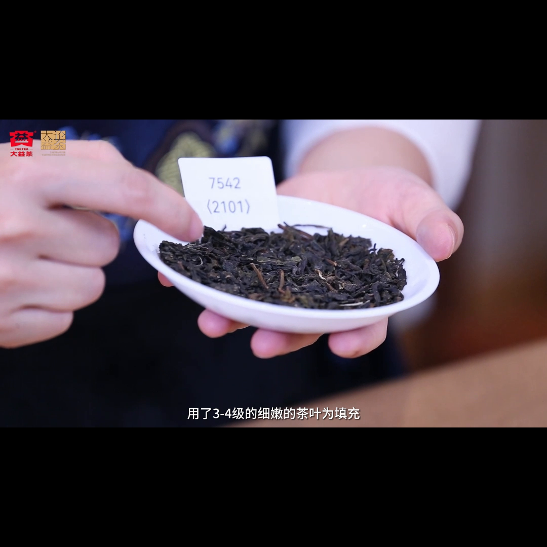 接下来我们一起来看一下这两款茶品。7542的产品架构当中采用了中壮的7级茶叶作为骨架,所以我们可以看得到在干茶上有一些相对成熟的叶片,用了3-4级的细嫩的茶叶为填充。在整个干茶上会有一些细嫩的芽嫩叶,还有一些嫩茎。那么采用了成熟的九级原料作为调配。